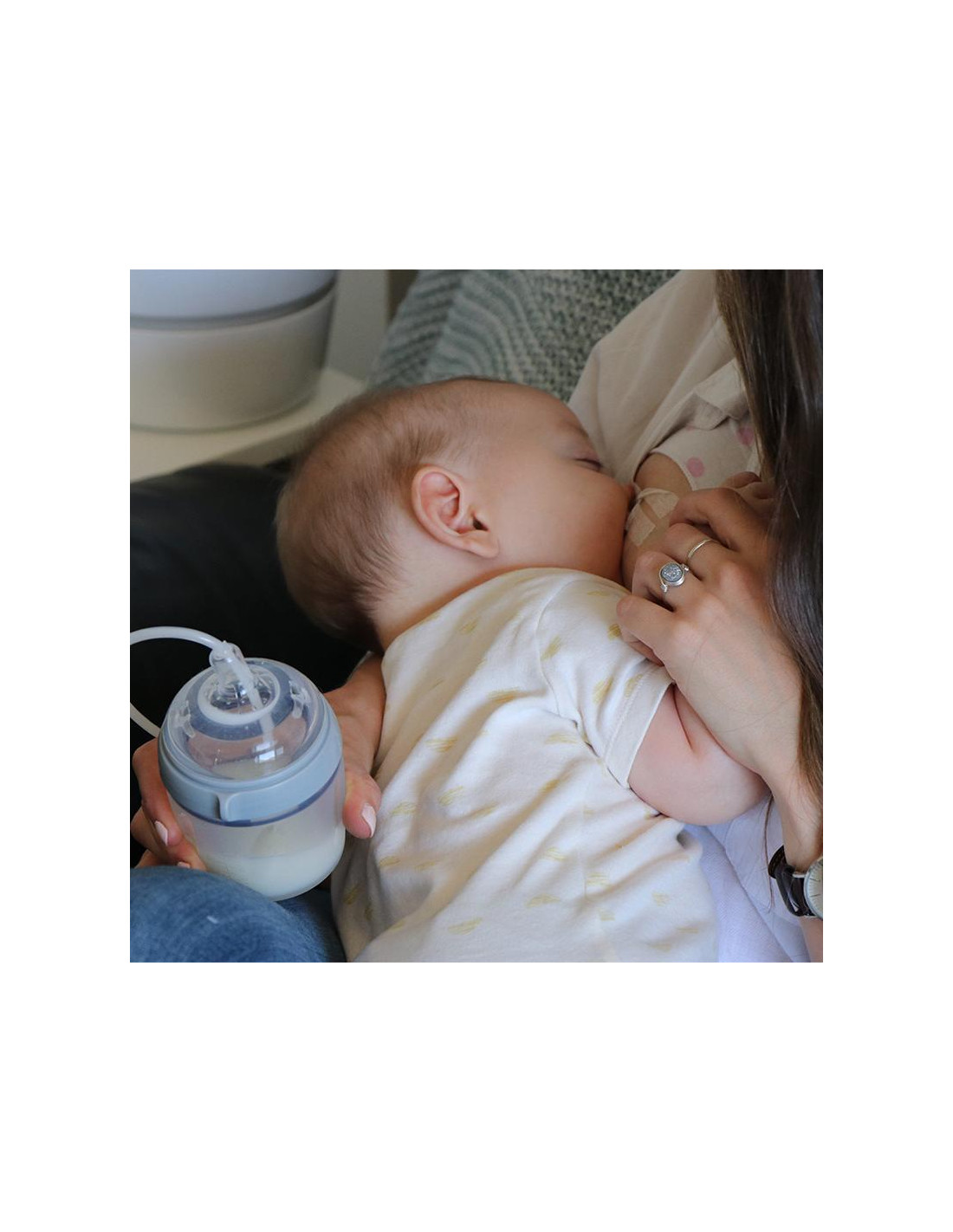 - Introduce your baby to your nipple and then place the thin outlet tube gently into their mouth to begin feeding.